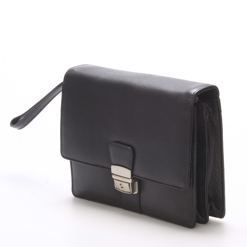 Pánske čierne jemné kožené etue s patinou a chlopňou. Určite si, či chcete nosiť tašku iba v ruke alebo využijete pútko a nasadíte si ho na ruku. Etue je veľmi jemné, mäkšie a príjemné na dotyk. Nechýbajú mu priehradky na peňaženku, kľúče či doklady. Využiť tiež možno priehradky na vizitky, kreditné karty, prípadne si môžete bankovky uložiť do vrecka na zips. Nechýba ani zadné vrecko so zipsom.