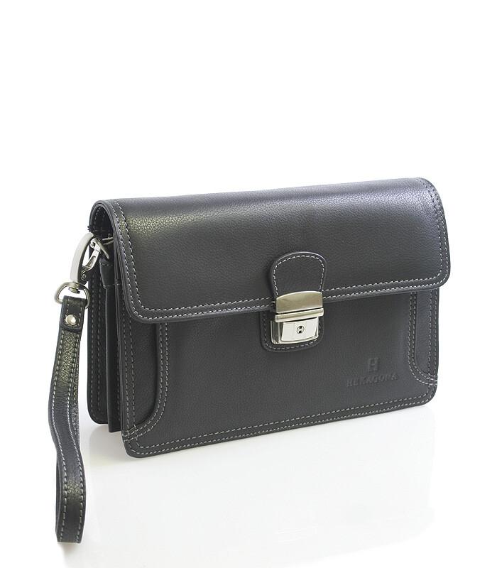 Pánske čierne kožené etue Hexagona s chlopňou na zámoček. Vnútri sú dve hlavné priehradky, jedna priehradka je na prednej strane. Ďalšie dve kapsičky sú na zips. Etue pojme peňaženku, telefón, kľúče a ďalšie nevyhnutné veci. Zozadu je ďalšie vrecko na zips. Súčasťou je kožené odnímateľné pútko na ruku.
