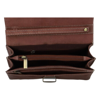 Pánske, hnedé etue z brúsenej kožte s chlopňou. Môžete si určiť sami, či chcete nosiť tašku iba v ruke, alebo využijete pútko a nasadíte si ho na zápästie. Etue je veľmi jemné, mäkšie a príjemné na dotyk. Nechýbajú mu priehradky na peňaženku, kľúče či doklady. Využiť možno aj priehradky na vizitky, kreditné karty, prípadne bankovky do vrecka na zips. Nechýba ani zadné vrecko so zipsom.