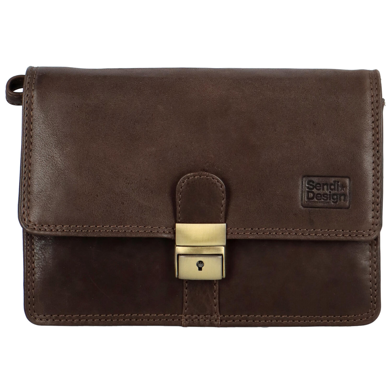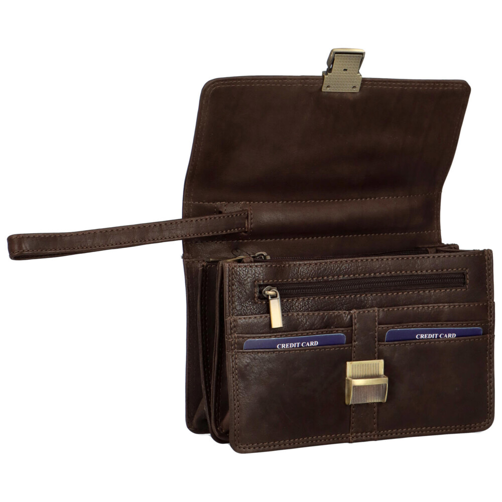 Elegantné, vráskavé, kožené, pánske etue z dielne značky SendiDesign . Malé pánske puzdro do ruky na osobné veci a potreby. Klopa pánskeho etue sa otvára kovovou sponou na kľúč. Etue je silnejšie, dvakrát prešité. Hlavná časť má tri fochy, dve vrecká so zipsami a na prednej strane (pod chlopňou) je niekoľko ďalších vreciek a vreciek na drobnosti, kreditky a vizitky. Samozrejmosťou je vrecko na zips na zadnej strane malej tašky. Súčasťou je aj celokožené pútko.