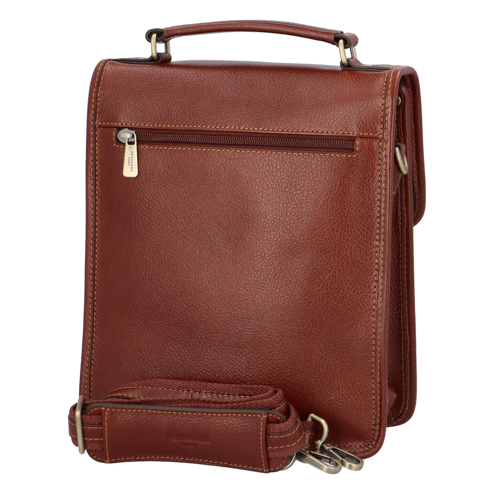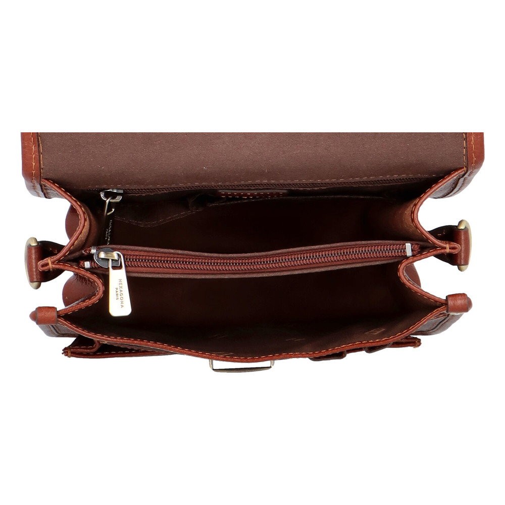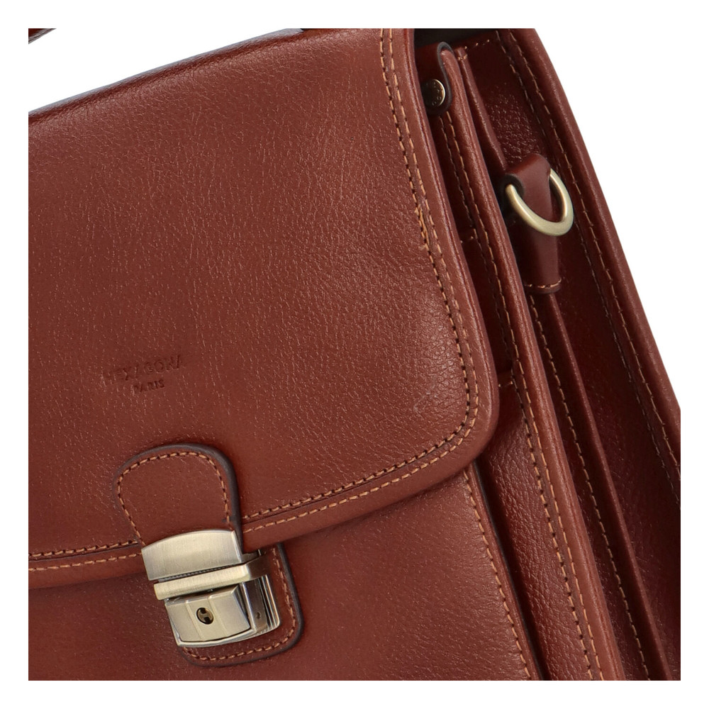 Pánske, hnedé, kožené etue Hexagona s chlopňou na zámok. Mať dostatočný priestor na doklady a ďalšie potreby je dôležité. Spokojnosť vám zaručí vďaka dvom hlavným vreckám, medzipriestoru s vreckom na zips a predným voľným priehradkám v podobe organizéra. Samozrejmosťou sú vrecká so zipsami na zadnej strane. Etue pojme peňaženku, telefón, kľúče, diár a ďalšie nevyhnutné veci. Súčasťou je kožený odnímateľný popruh, vďaka ktorému môžete nosiť etue aj cez plece, navyše je tu kvalitné kožené vystuženie.