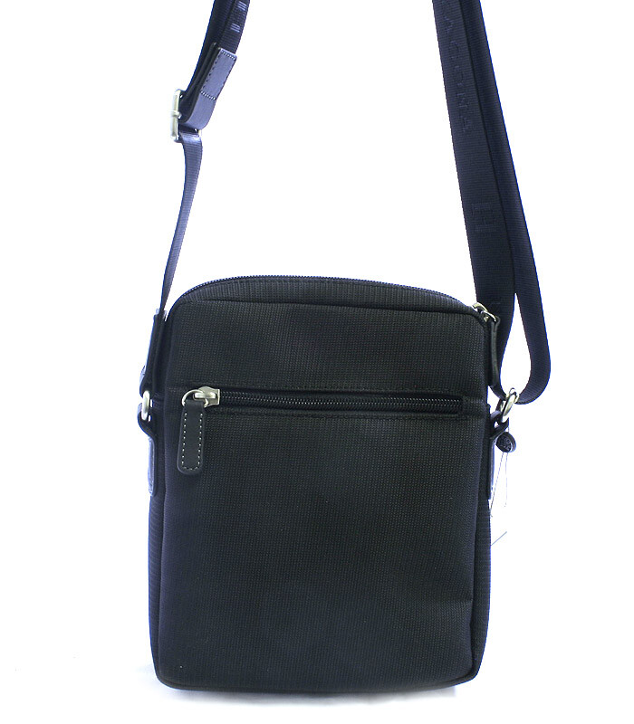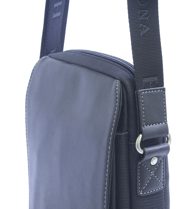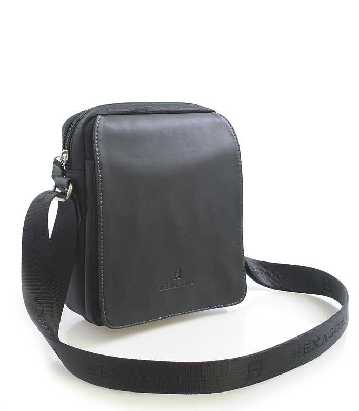 Čierna pánska taška cez plece Hexagona na doklady. Hlavné vrecko je na zips, vo vnútri je ďalšie vrecko so zipsom. Pod chlopňou je jedno vrecko bez zipsu. Súčasťou tašky je nastaviteľný popruh z nylonu.