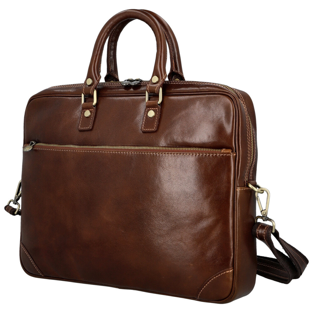Elegantná sila v každom detaile. Táto kožená business taška je stvorená pre dni, kedy potrebujete mať prehľad, štýl aj tempo. Hladký kožený povrch a čistý dizajn pôsobia sebavedome a profesionálne, bez zbytočných okrás. Hlavné vrecko na zips ponúka prehľadný riešený vnútorný priestor s vreckami v podšívke, ktoré udržia dokumenty aj pracovné nevyhnutnosti perfektne usporiadané. Praktické veľké zipsové vrecká v prednej aj zadnej časti sú ideálne pre veci, ktoré chcete mať ihneď po ruke. Pevné uchá skvele padnú do ruky a nastaviteľný ramenný popruh zaistí pohodlie aj pri celodennom nosení. Mosadzné kovanie dodáva taške moderný business charakter s nádychom luxusu. Taška, ktorá drží krok s vašimi cieľmi. Objednajte ešte dnes a vyskúšajte, vrátiť ju môžete až za 30 dní!