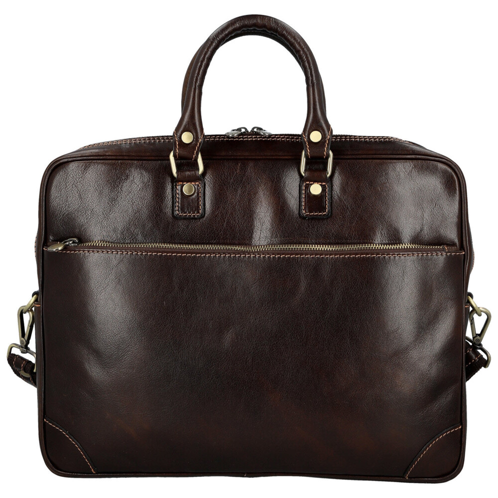 Elegantná sila v každom detaile. Táto kožená business taška je stvorená pre dni, kedy potrebujete mať prehľad, štýl aj tempo. Hladký kožený povrch a čistý dizajn pôsobia sebavedome a profesionálne, bez zbytočných okrás. Hlavné vrecko na zips ponúka prehľadný riešený vnútorný priestor s vreckami v podšívke, ktoré udržia dokumenty aj pracovné nevyhnutnosti perfektne usporiadané. Praktické veľké zipsové vrecká v prednej aj zadnej časti sú ideálne pre veci, ktoré chcete mať ihneď po ruke. Pevné uchá skvele padnú do ruky a nastaviteľný ramenný popruh zaistí pohodlie aj pri celodennom nosení. Mosadzné kovanie dodáva taške moderný business charakter s nádychom luxusu. Taška, ktorá drží krok s vašimi cieľmi. Objednajte ešte dnes a vyskúšajte, vrátiť ju môžete až za 30 dní!