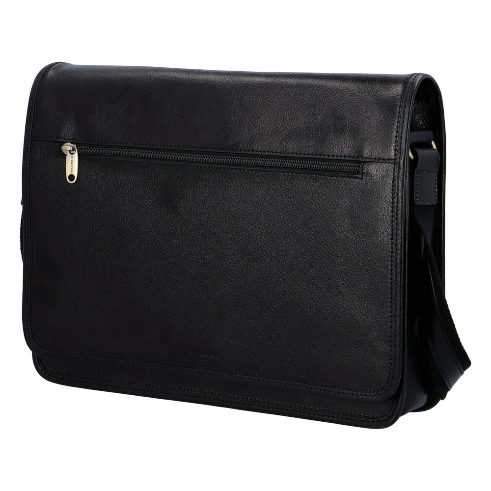 Čierna celokožená taška pre mužov, od značky Hexagona. Luxusný, kvalitný model, ktorý je elegantný a štýlový. Hodiť sa Vám bude samozrejme nielen v práci, ale aj v meste. Nosiť ju možno pohodlne cez plece alebo crossbody. Pohodlne sem uložíte spisy, osobné veci aj notebook (max. 33,5 x 24 cm). Taška sa otvára klopou s magnetickým nitom, má perfektne lemované a prešívané okraje. Pod klopou sú dve veľké vrecká, jedno voľné a jedno so zipsom. Hlavné vrecko sa zapína zipsom a okrem vrecka na notebook tu nájdete stredne veľkú kapsu na zips a menšie voľné kapsičky na osobné veci ako je telefón a perá. Zadná strana tašky je prešívaná a nechýba jej vrecko so zipsom. Popruh je v kombinácii textilu a kože. Doprajte si skutočne mužskú záležitosť.