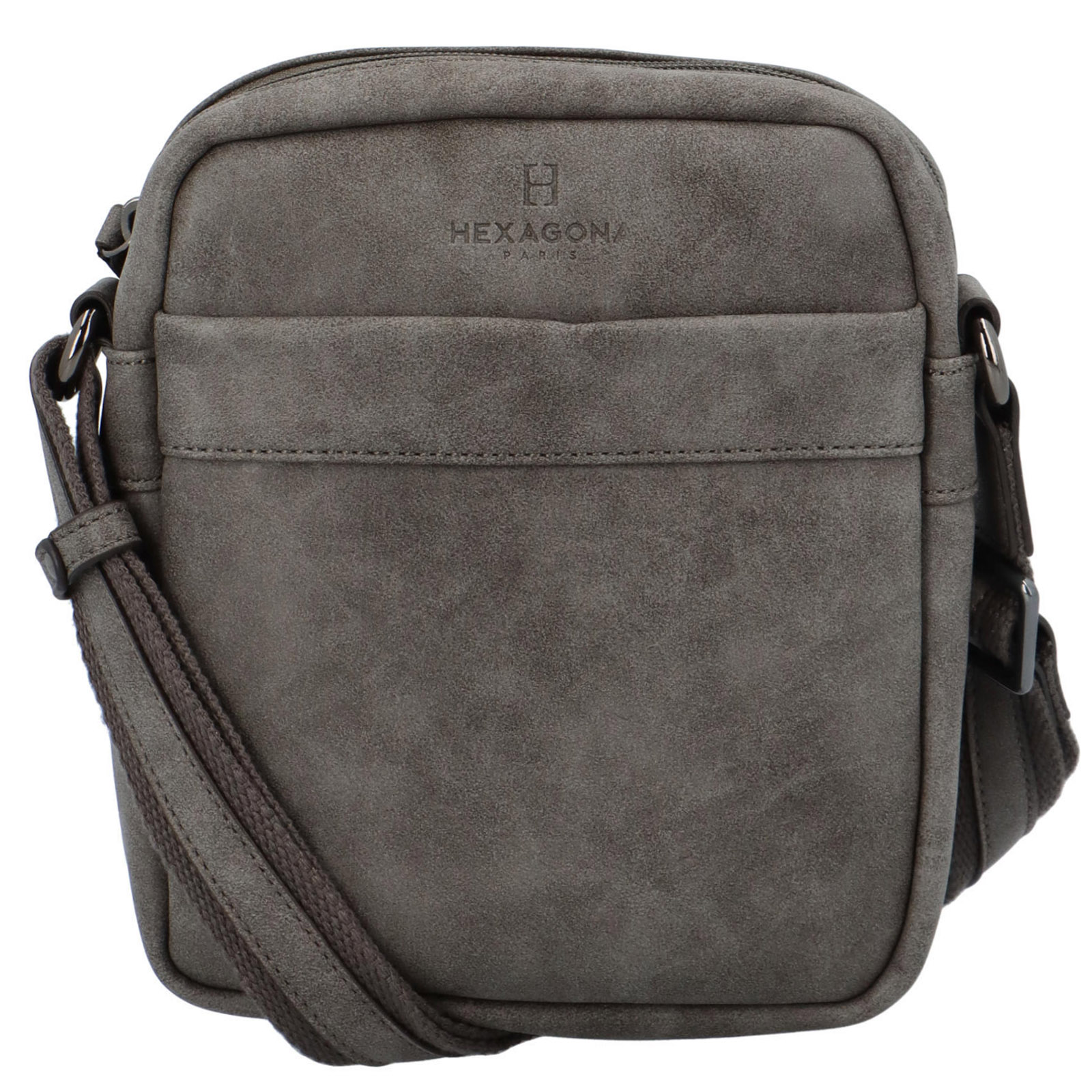 Pánska sivá kožená crossbody v menšom rozmere od francúzskej značky Hexagona. Hlavné vrecko je na zips a obsahuje menšiu postrannú priehradku a vrecko na zips. Predná strana crossbody má priehradku na magnetický cvoček a zadná strana priehradku na zips. Popruh je z časti látkový, z časti kožený a je nastaviteľný na požadovanú dĺžku.
