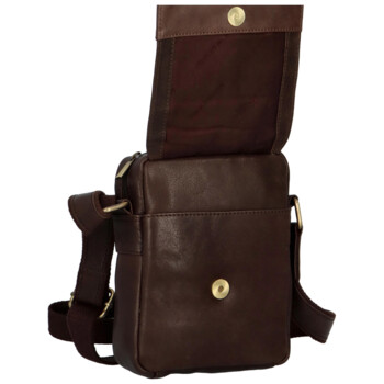 Kvalitná, pánska, osobná, kožená taška na doklady v tmavo hnedej farbe. Žiadny muž sa bez takej malej tašky neobíde. Taška má polovičnú klopu na magnet, pod ňou je malé voľné vrecko na drobnosť. Popruh tašky je polokožený a celkovo ide o malú crossbody tašku či tašku cez rameno. Na zadnej strane je klasické vrecko na zips. Hlavné úložisko sa zapína zipsom a vo vnútri nájdete vrecko na telefón alebo ďalšie drobnosti.