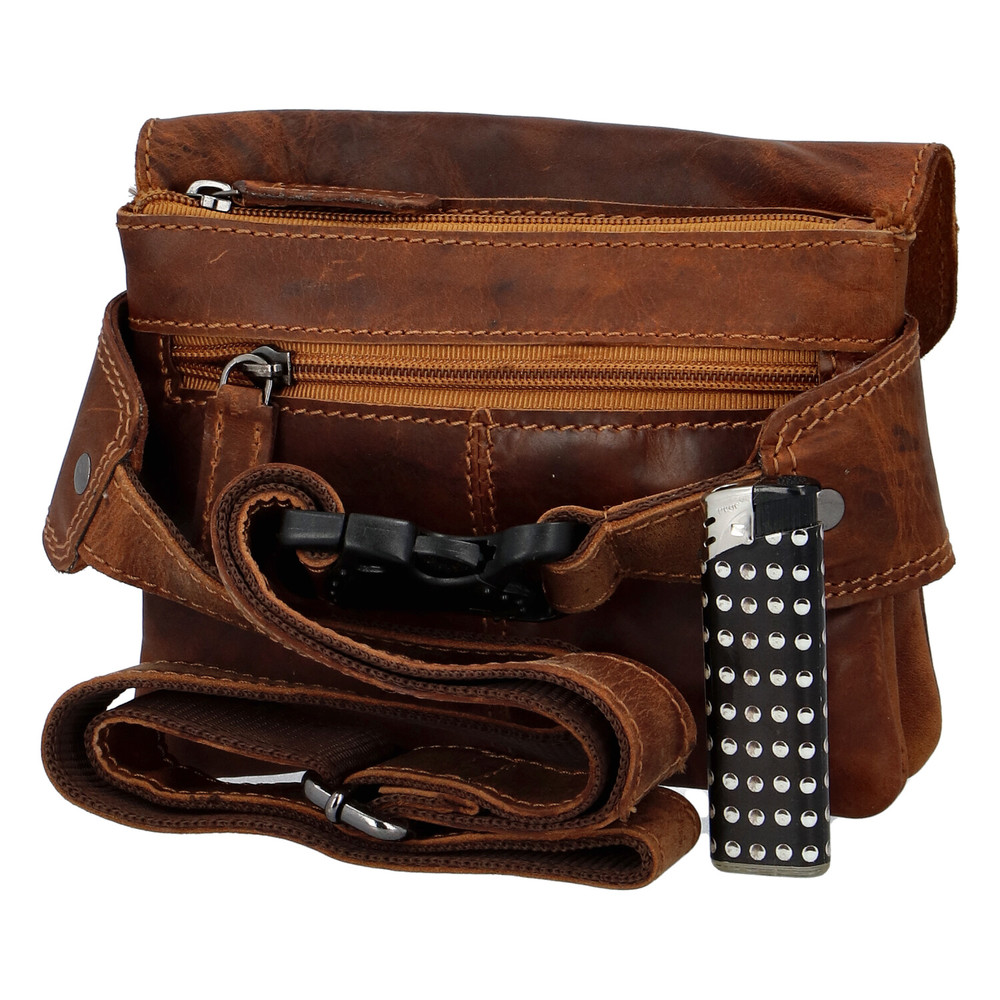 Štýlová pánska ľadvinka z pravej hovädzej kože značky Greenwood je ideálnym doplnkom pre každodenné nosenie aj cestovanie. Vďaka svojmu elegantnému vintage vzhľadu a precíznemu spracovaniu zaujme na prvý pohľad. Praktické zapínanie na klopu s okrasnou kovovou prackou a pod ňou vrecko. Ďalšie dve vrecká na zips sú v zadnej časti. Nastaviteľný kožený popruh s plastovou sponou na pohodlné nosenie okolo pása alebo cez rameno. Elegantné logo je vyrazené na prednej strane. Toto vrecko spája tradičné remeselné spracovanie s moderným funkčnosťou. Objednajte ešte dnes a vyskúšajte, vrátiť ju môžete až za 30 dní!