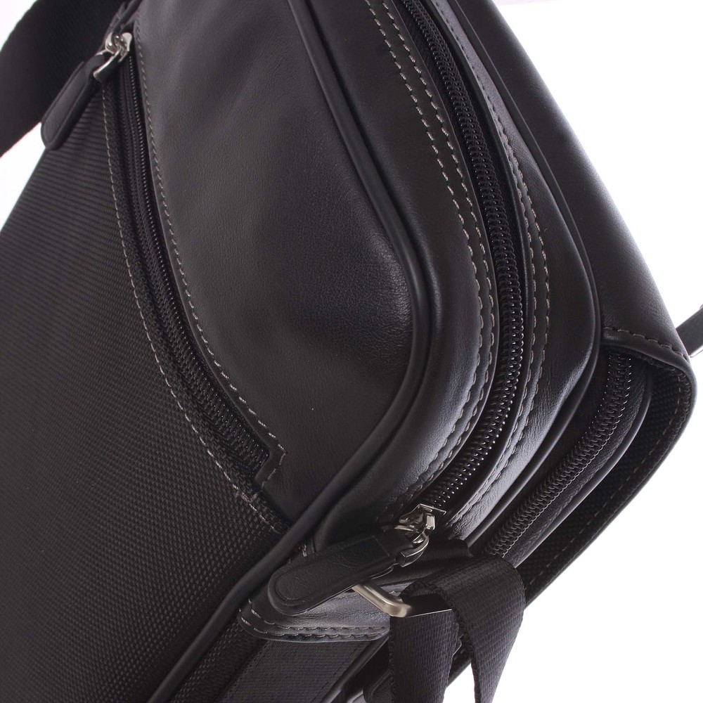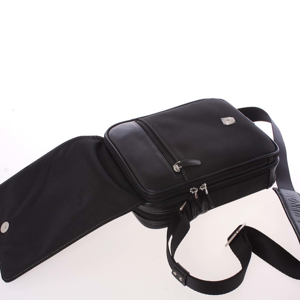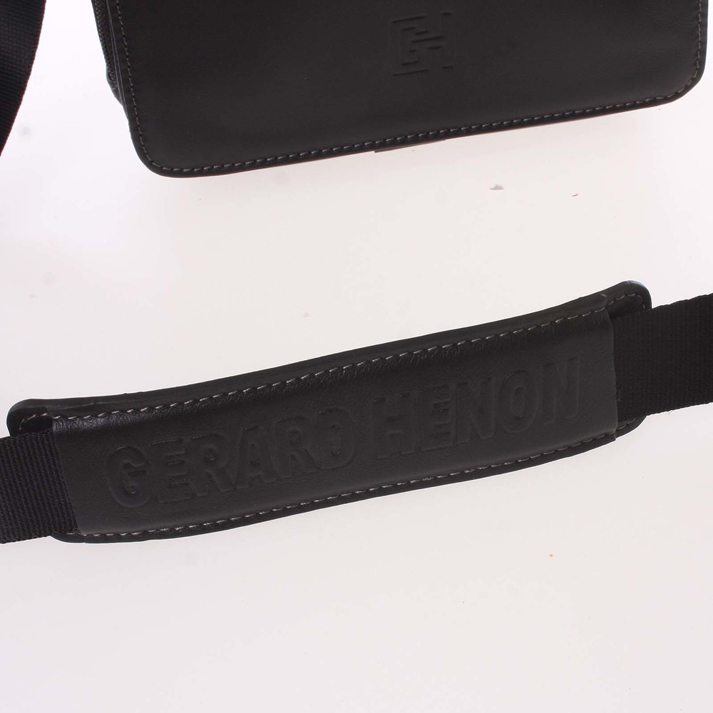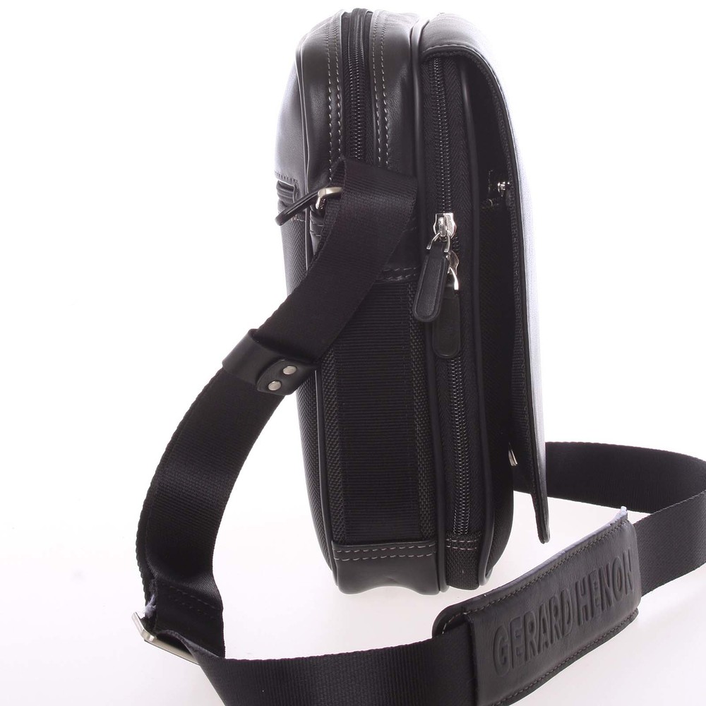 Čierna elegantná pánska kožená menšia taška na doklady a osobné veci od značky Gerard HENON v kombinácii s veľmi kvalitným nylonom. Chlopňa sa otvára pomocou magnetického cvočku, pod ňou je jedno väčšie a jedno menšie vrecko, obe na zips. Na zips je aj hlavné vrecko vo vnútri ktorého je okrem dostatku priestoru menšie vrecko so zipsom na cennosti. Kabelke nechýba vrecko na zadnej strane. Popruh je z pevnej látky s koženými detailmi a posuvnou výstužou na rameno. Novinka! Objednajte ešte dnes a vyskúšajte, vrátiť ju môžete až do 30 dní!