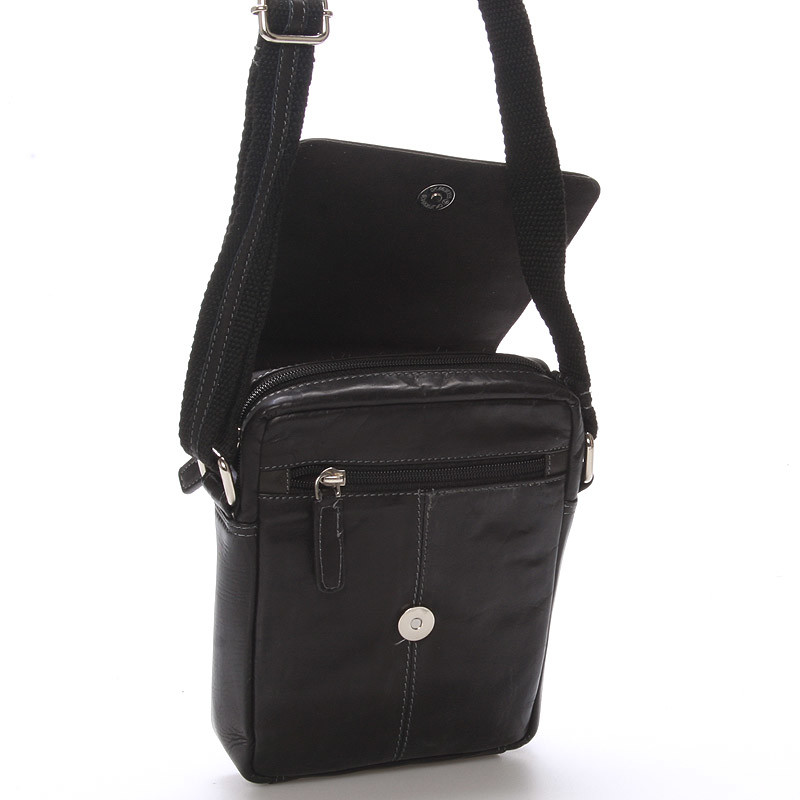 Novinka. Objednajte ešte dnes a vyskúšajte, vrátiť ju môžete až do 30 dní! Predstavujeme Vám novinku od značky WILD Collection . Čiernu pánsku koženú kabelku na doklady cez rameno. Taška je vyrobená z pevnej hovädzej kože a má už vytvorenú patinu. Chlopňa je na magnetický gombík, vnútri sú vrecúška na drobnosti a súčasťou je nastaviteľný popruh.