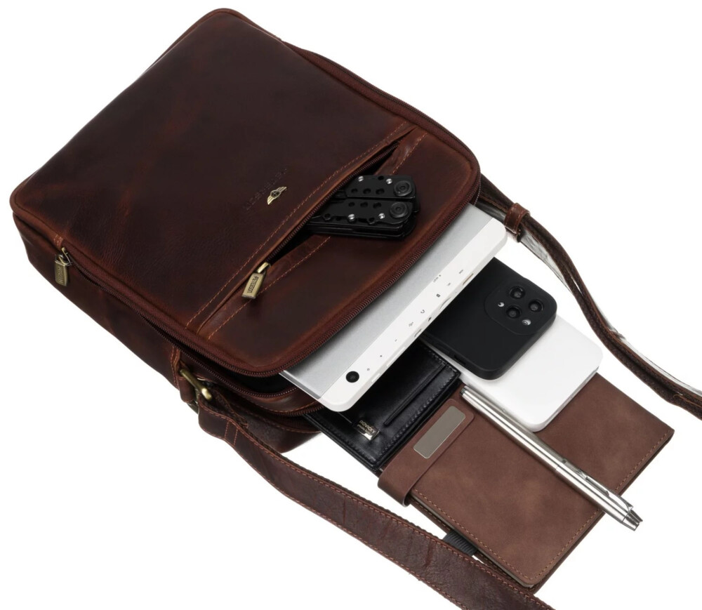 Kvalitná pánska crossbody taška z pravej kože pôsobí elegantne a nadčasovo. V prednej časti ju zdobí zipsové vrecko a decentné logo značky, ktoré podčiarkujú jej sofistikovaný vzhľad. Taška má dve hlavné vrecká, užšie vhodné na menšie tablet a priestrannejšie pre osobné veci, obe zaistíte zipsy. Na zadnej strane sa nachádza praktické otvorené vrecko pre rýchly prístup k drobnostiam. Mosadzné kovanie dodáva taške štýlový vintage nádych, zatiaľ čo dlhý kožený popruh umožňuje pohodlné nosenie cez rameno alebo krížom. Ojednajte ešte dnes a vyskúšajte, vrátiť ju môžete až za 30 dní!