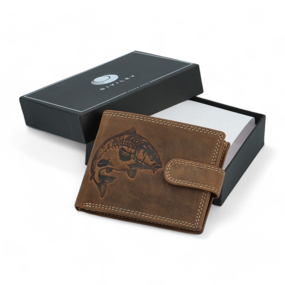 Krásna hnedá peňaženka od značky Diviley, ktorá vás zaujme svojou kvalitou a krásnym motívom kapra vypáleným na prednej strane. Precízne spracovanie obľúbeného strihu peňaženky z veľmi kvalitnej, príjemnej brúsenej kože sa naozaj vydarilo. Peňaženka je šitá na šírku a je zaistená zápinkou. Po otvorení ponúka priestor na bankovky a vrecko na cvok pre mince. Vnútri nájdete aj stredové zipsové vrecko a ďalšiu zápinku, kde sa ukrývajú priehradky na platobné karty, doklady a vizitky. Štýlová a praktická peňaženka, pre všetky vaše doklady. Tento kožený kúsok zdobí prešitie po obvode, ktoré dodáva peňaženke šmrnc. Dodávané v darčekovej krabičke. Objednajte ešte dnes a vyskúšajte! Vrátiť ju môžete až do 30 dní!