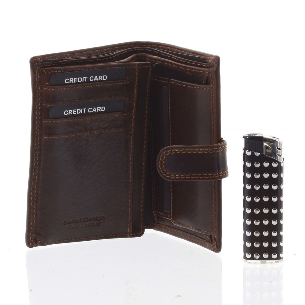 Luxusná hnedá pánska kožená peňaženka na výšku, so zápinkou, s dvomi vreckami na bankovky od značky SendiDesign. Ponúka dostatok potrebných priehradok na karty (min. 8), mince a doklady v kvalitnom spracovaní. Spolu s taškou na doklady značky SendiDesign bude ideálnym darčekom. Peňaženka je v originálnej krabičke. Objednajte ešte dnes a vyskúšajte, vrátiť ju môžete až do 30 dní!