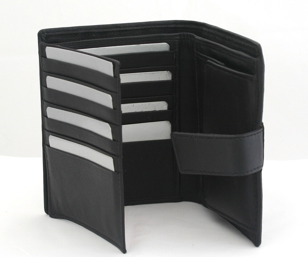 Tmavo hnedá kožená peňaženka. Vnútri - miesto na bankovky, vrecko na mince, priehradky na doklady a kreditné karty.