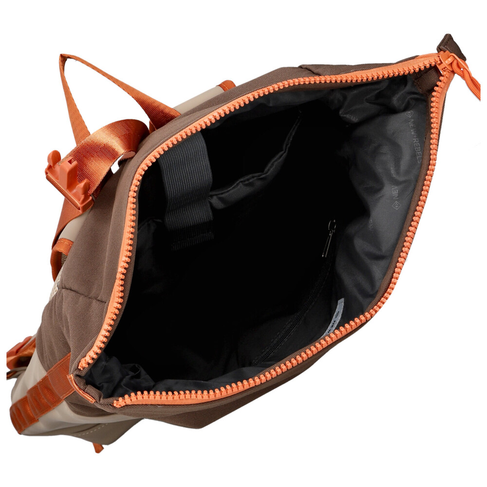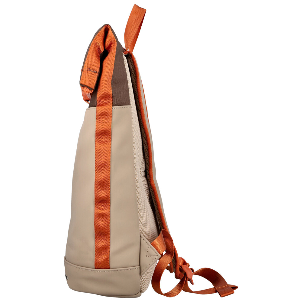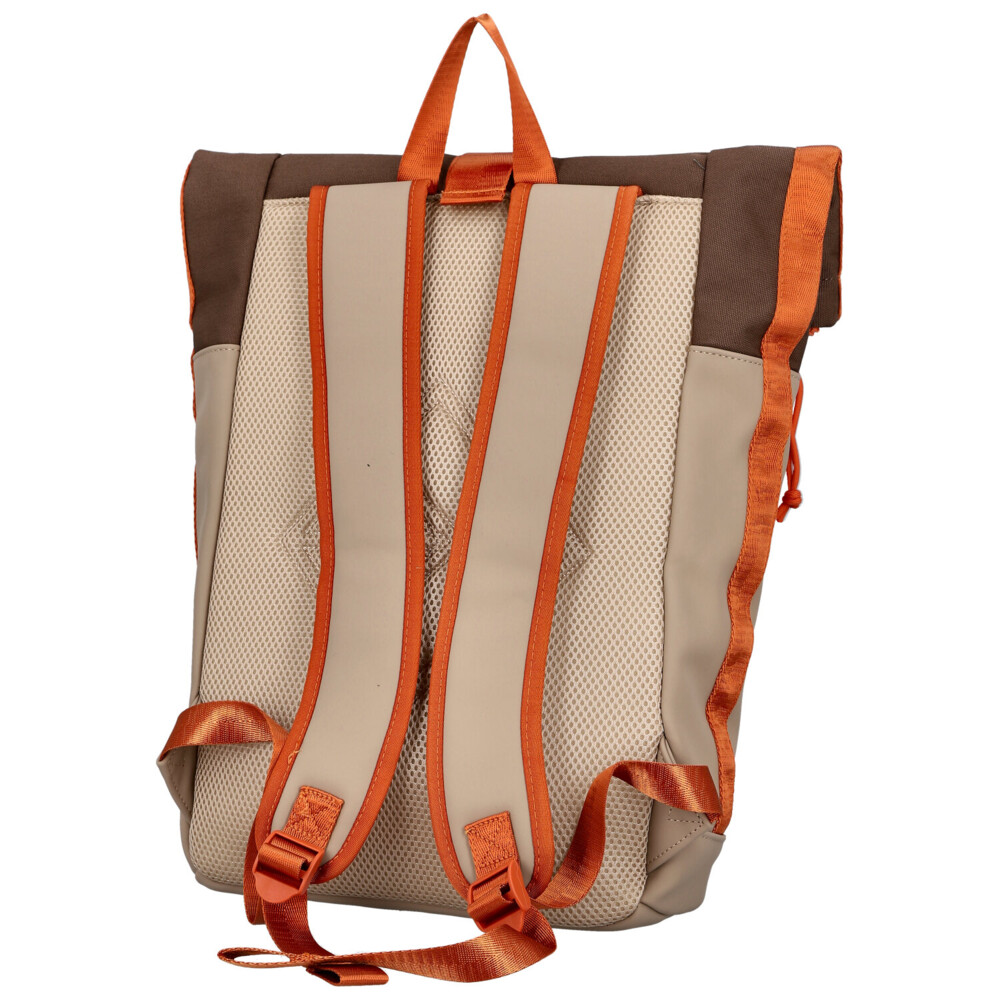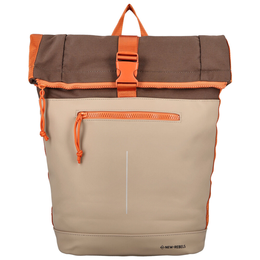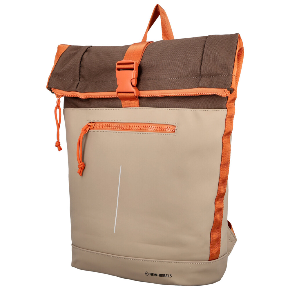 Štýlový unisex roll-on batoh New Rebels v kombinácii pogumovaného tela a pevnej textílie tentoraz prichádza v hravom farebnom prevedení. Textilná klopa, boky batohu, zipsy aj olemovanie majú kontrastné farby, ktoré dodávajú celému batohu moderný a výrazný vzhľad. Rolovacia vrchná časť je z pevnej látky, zatiaľ čo spodné telo tvorí pogumovaný materiál odolný proti vlhkosti.