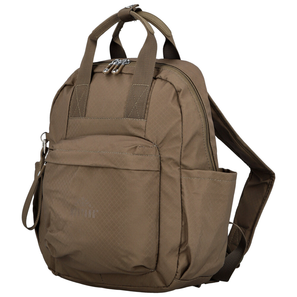 Menší batôžtek Mustang z odolnej textílie je praktickým a štýlovým doplnkom na každý deň. Hlavný priestor na zips ponúka vnútorné postranné priehradky – jednu na zips a jednu voľnú – na prehľadné uloženie potrebných drobností. Po bokoch batohu sa nachádzajú dve menšie otvorené priehradky, ideálne napríklad na vreckovky alebo malé fľaše.