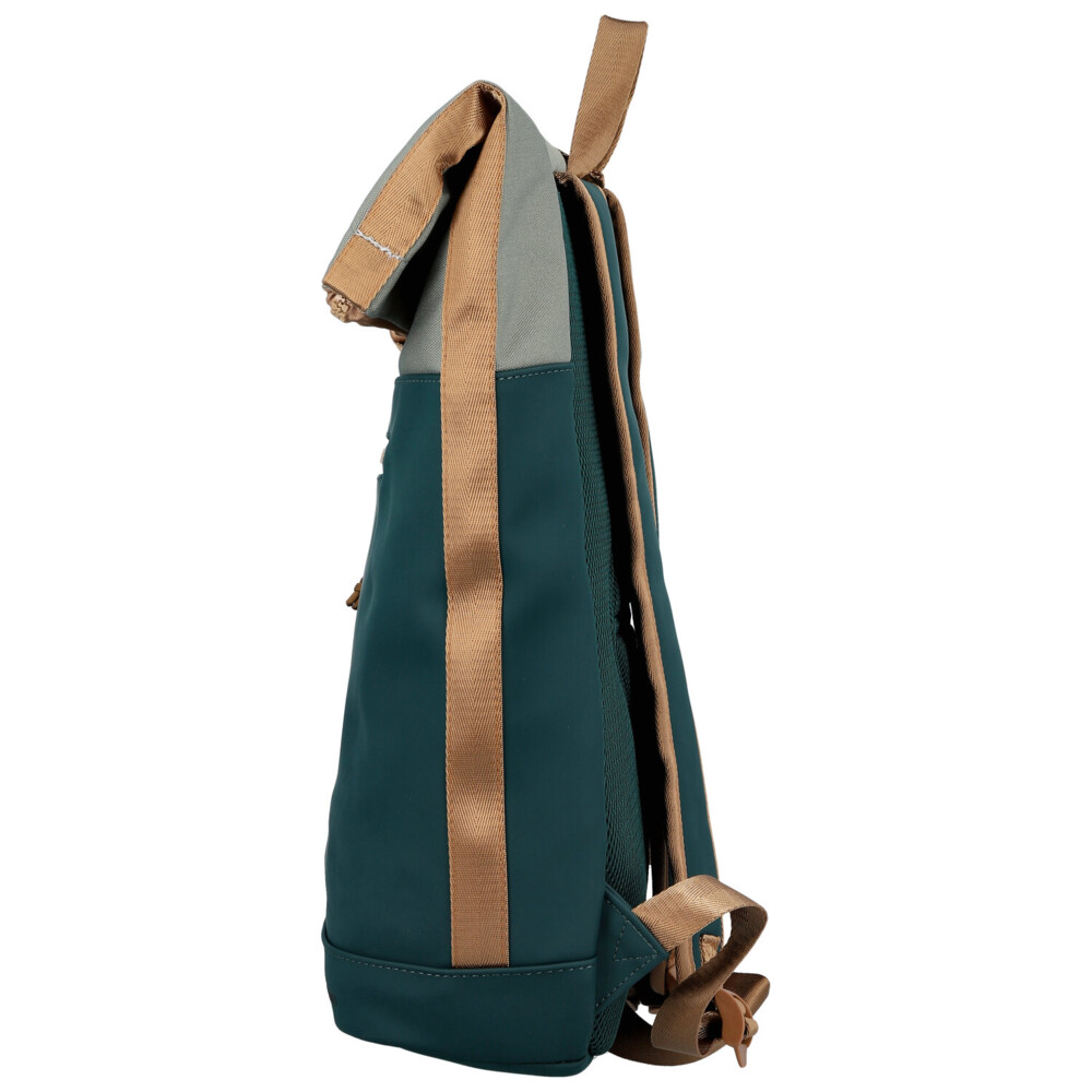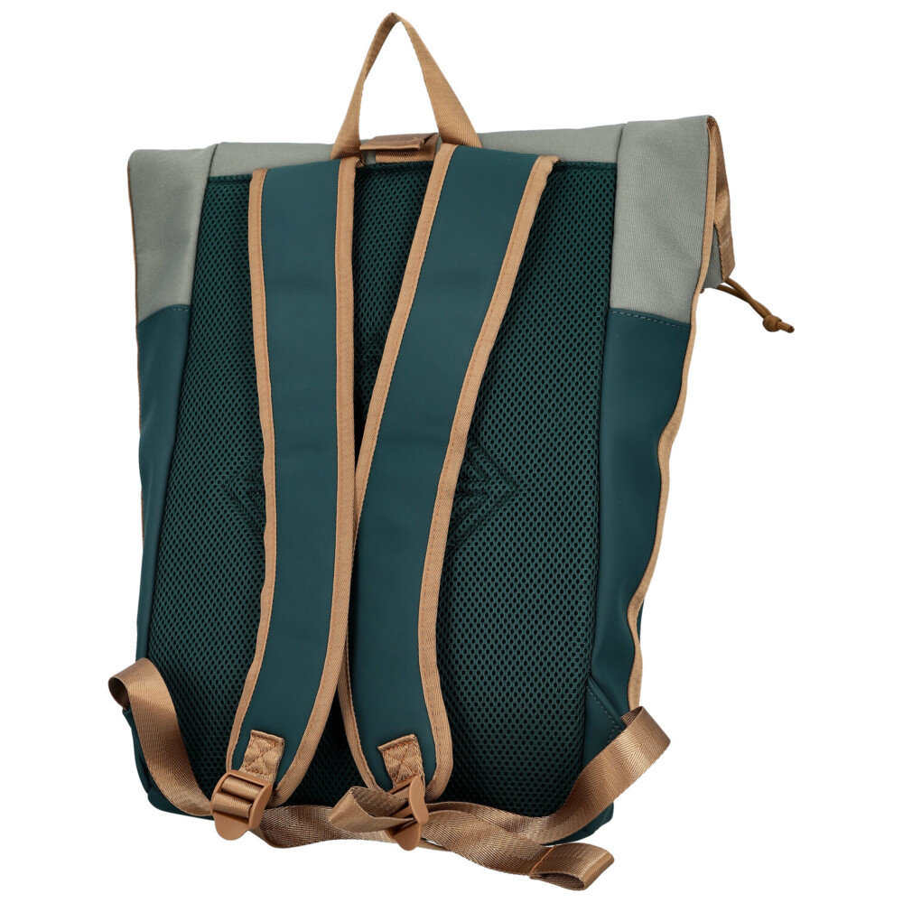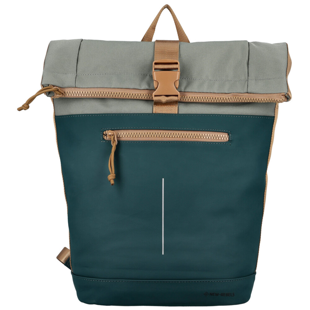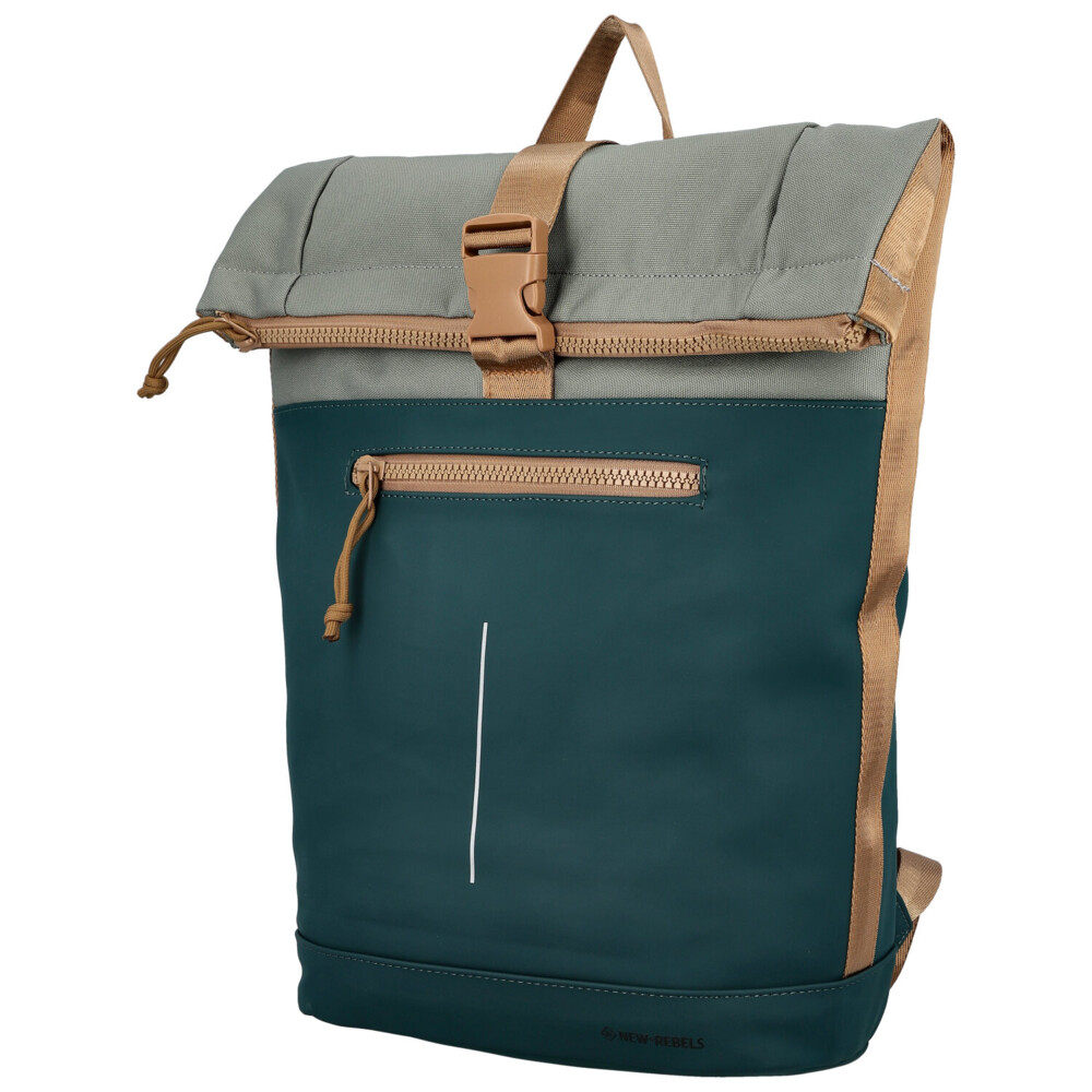 Štýlový unisex roll-on batoh New Rebels v kombinácii pogumovaného tela a pevnej textílie tentoraz prichádza v hravom farebnom prevedení. Textilná klopa, boky batohu, zipsy aj olemovanie majú kontrastné farby, ktoré dodávajú celému batohu moderný a výrazný vzhľad. Rolovacia vrchná časť je z pevnej látky, zatiaľ čo spodné telo tvorí pogumovaný materiál odolný proti vlhkosti.