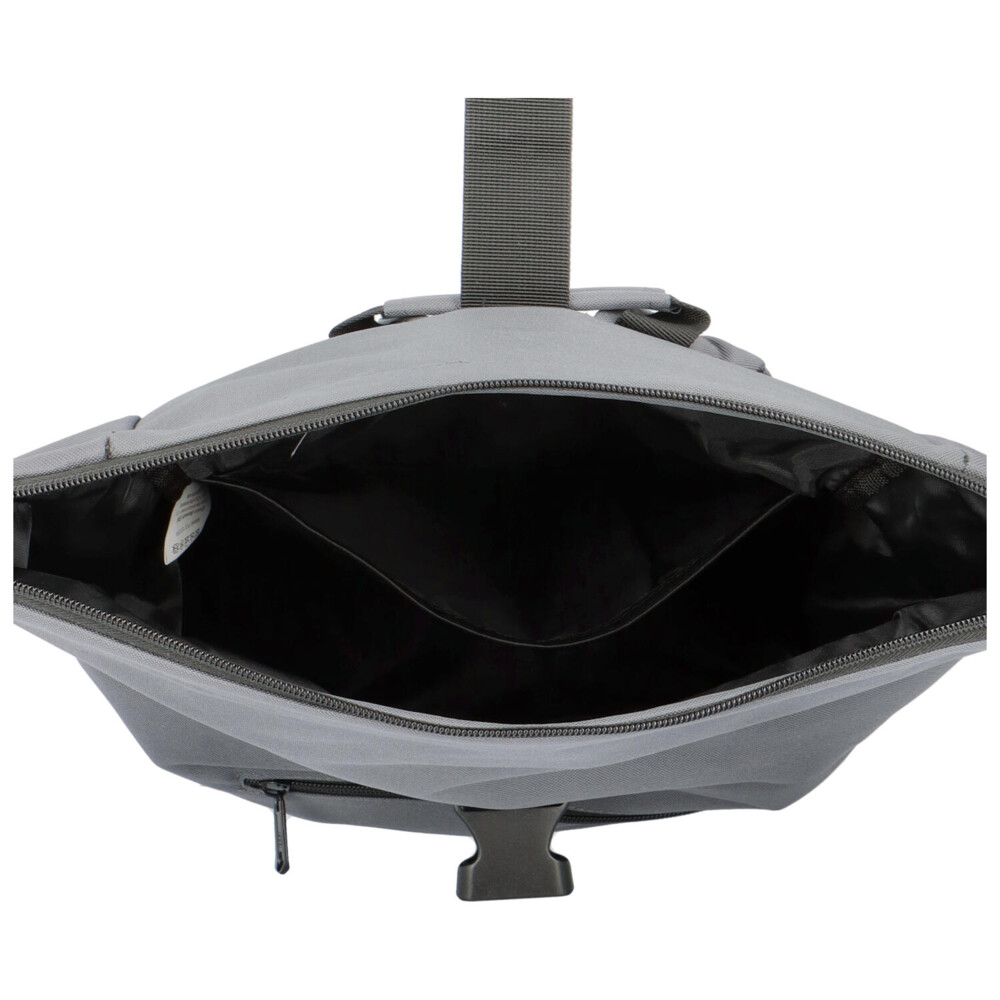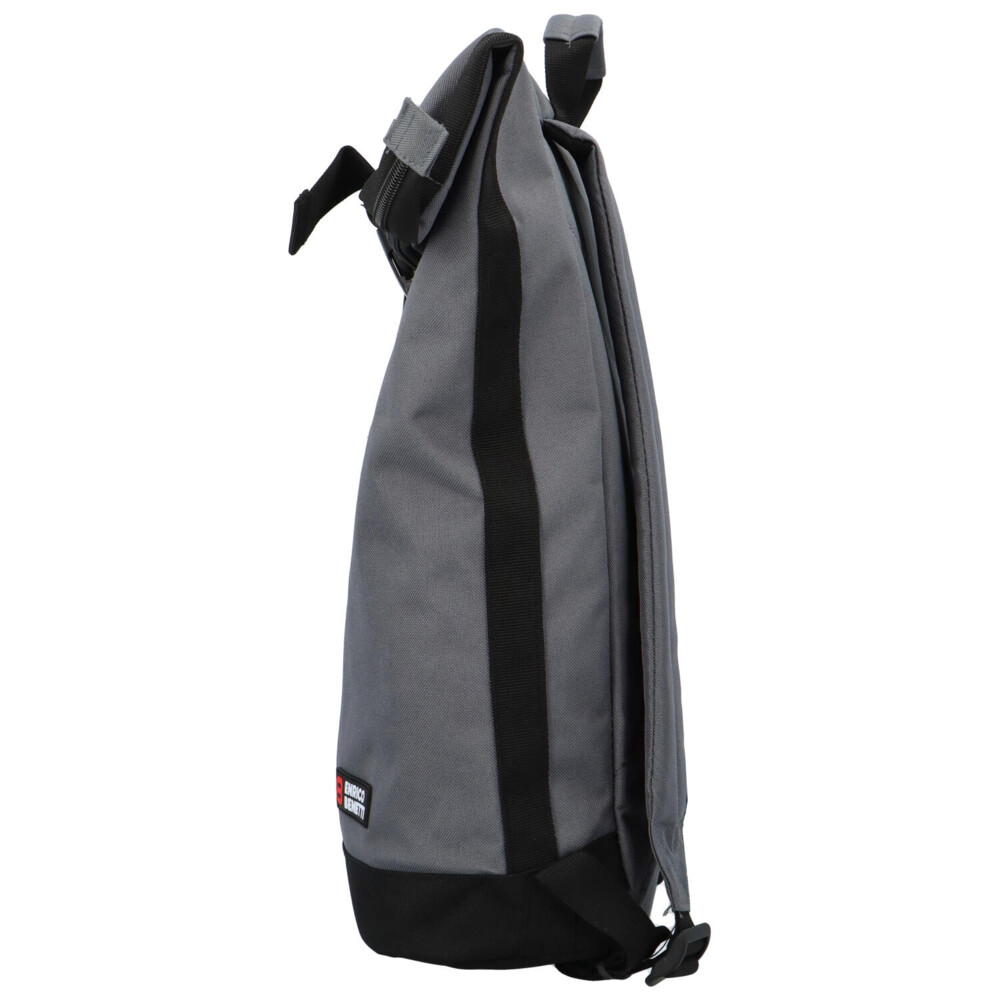 Veľký šedý rolovací batoh, ktorý je možné využiť pri výletoch, cestovaní, v práci aj do školy. Objednajte ešte dnes a vyskúšajte, vrátiť ho môžete až za 30 dní! Hlavné vrecko sa otvára veľkým zipsom. Je možné ho tiež upnúť prehnutím krátkej chlopne k plastovej pracke. Na prednej strane batohu je menšie vrecko so zipsom. Vnútri hlavného priestoru, si možno do postrannej priehradky uložiť aj notebook (max. 32 x 25 cm). Dno plecniaka je vystužené.