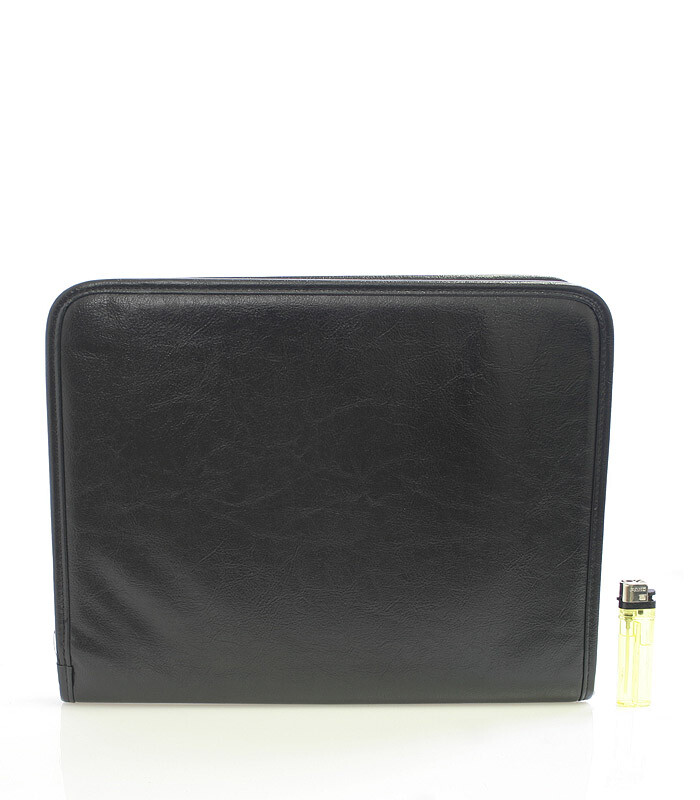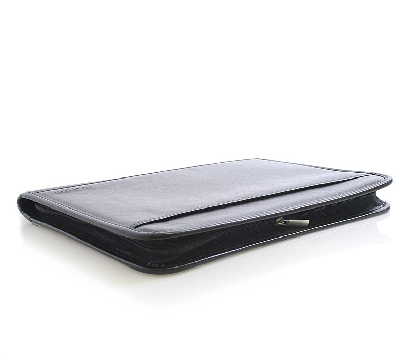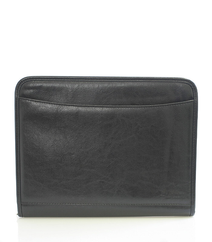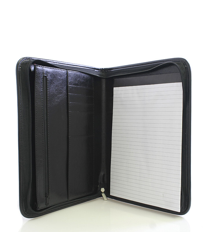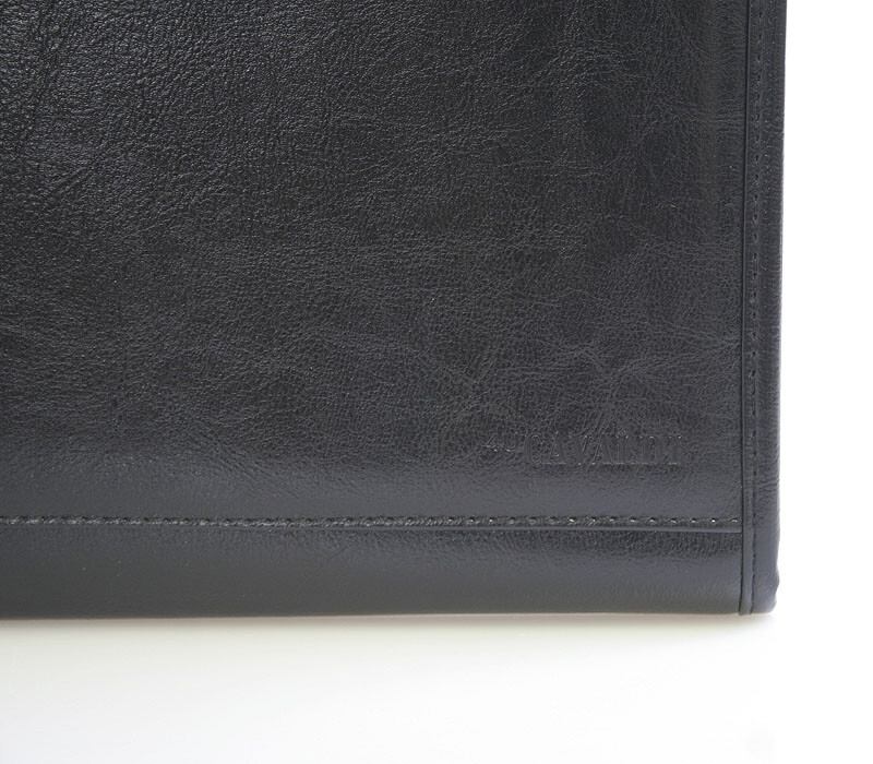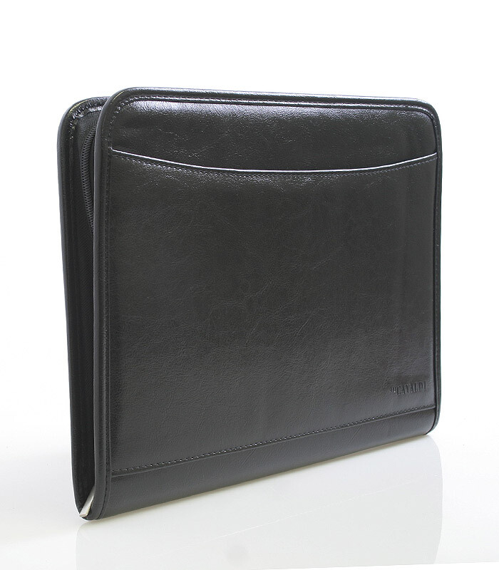 Elegantná čierna spisovka s poznámkovým blokom Cavaldi bez ucha. Spisovku možno nosiť iba v ruke. Otvára sa zipsom po obvode. Vnútri je poznámkový blok (odnímateľný) a ďalšie vrecká na drobnosti. Na prednej strane je vrecko na A4 bez zipsu.