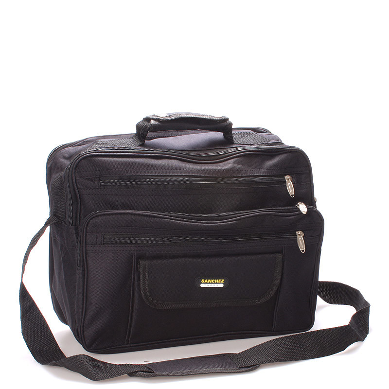 Čierna väčšia pánska kabela cez plece Sanchez s popruhom a uchom. Taška má veľa vreciek na zips, dáte do nej všetko čo potrebujete. Do tašky sa zmestí aj notebook s max. rozmermi 31 x 26 cm. Kolekcia 2016.