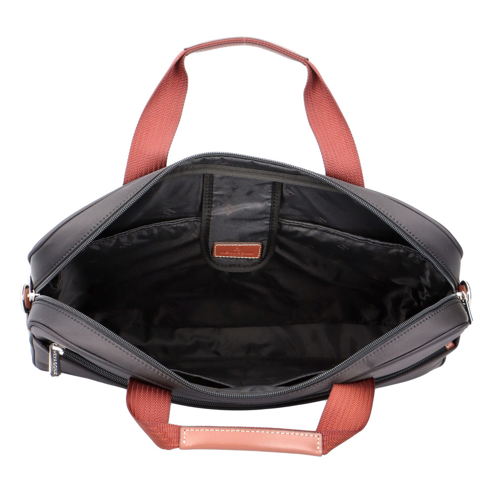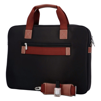 Luxusná pracovná brašňa od značky Hexagona s koženými detailmi. Multifunkčná, moderná, ľahká taška na notebook. Používať ju môžu páni aj dámy. Skvele padne k obleku, kostýmu aj ležérnejšiemu oblečeniu. Má čiernu farbu s ľahkým odleskom materiálu, hnedo sfarbené detaily, uši i popruh. Ten má kožené posuvné vystuženie na plece. Predná strana tašky ponúkne veľkú kapsu so zipsom, na zadnej strane nájdete kapsu na zips tiež. Pod ňou je prišité polyesterové pútko na madlo kufra. Cestovanie tak bude jednoduchšie. Hlavné vrecko má duálny zips, vnútorný priestor ponúka dve voľné, stredne veľké kapsičky a vystuženú priehradku na notebook (max. 40 x 30,5 cm). Ten môžete ukotviť pásom so suchým zipsom.