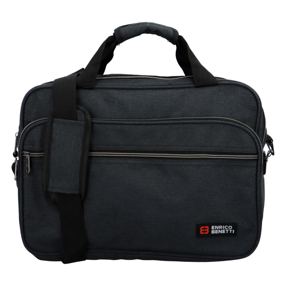 Ľahká, priestranná, čierna taška - taška E nrico Benetti, perfektný tip pre pánov i dámy, ako pracovný či športový kúsok. Popruh tejto tašky je nastaviteľný a nechýba tu posuvné vystuženie na plece. Dno tašky je možné spevniť pomocou vložky. Hlavné vrecko sa otvára dvojitým širokým zipsom a na konci otvárania je navyše suchý zips. Na dokumenty je možné využiť ďalšie veľké vrecko so zipsom. Ďalšie dve stredne veľké vrecká sú na prednej strane tašky, vo vnútri jedného z nich sú dve voľné sieťované vrecká. Spodná strana disponuje plastovými cvokmi, ktoré Vám budú nápomocné pri zaistení stability tašky. Nosiť tašku môžete aj za uchá, ktoré sú pre Vaše pohodlie zaistené vystužením so suchým zipsom. Zadná strana ponúkne široké pútko so suchým zipsom na pripevnenie tašky na madlo kufra. Novinka! Objednajte ešte dnes a vyskúšajte! Vrátiť ju môžete až za 30 dní!